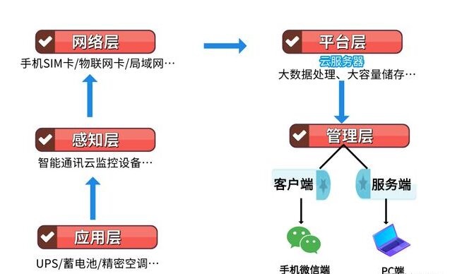 我們多次提到動環監控方案是由溫濕度模塊、電力監控模塊、漏水檢測模塊、安防監控模塊、網絡監控模塊等組成的綜合性監控系統。那么這次我們來聊聊動環監控方案的基本結構。 從基本結構上來講,動環監控方案可以由三部分組成,分別是:信息感知層(前端監控)、網絡通信傳輸層(無線傳輸部分)、應用服務層(后臺管理中心)三部分成。 一、信息感知層(前端監控) 信息感知層(前端監控)主要由物聯網設備組成,因此它又稱為物聯網設備端。根據應用場景的不同,感知層搭載的設備是多種多樣的,包括溫濕度監控模塊、漏水監控模塊、ups監控模塊、發電機監控模塊、空調監控模塊、門禁監控模塊、防盜監控模塊、消防監控模塊等。主要復雜前端信息的采集,最主要的性能就是數據采集,采集的信息包括環境信息、性能信息、異常信息和業務信息。 二、網絡通信傳輸層(無線傳輸部分) 網絡通信傳輸層(無線傳輸部分)是整個網絡體系結構中的關鍵層次之一,主要負責向兩個主機中進程之間的通信提供服務。信息感知層(前端監控)將溫濕度監控模塊、漏水監控模塊、ups監控模塊、發電機監控模塊、空調監控模塊、門禁監控模塊、防盜監控模塊、消防監控模塊等采集到的信息傳輸到網絡通信傳輸層,而網絡通信傳輸層作為橋梁將信息傳輸到后臺管理中心,并對這些信息進行集中監控與管理。 三、應用服務層(后臺管理中心) 應用服務層(后臺管理中心)的主要作用是接收、處理網絡通信傳輸層傳來的各項數據,同時通過后臺大屏、手機端、PC端對數據進行觀察、判斷,并對出現的異常進行報警。 動環監控解決方案依靠這三大部分完成系統的采集、分析、傳輸、監控和管理,完成機房、圖書館、博物館等的24小時無人值守下安全、穩定、持續運行。